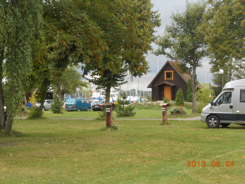 Idag duggade det när vi åkte. Det blev inte så lång tur idag bara 11 mil för campingen låg där den skulle och solen sken. Det är en camping som ligger på en marina. Här finns även en restaurang där vi intog vår middag idag. Varsin grillad grisnacke (= fläsk-karré).
