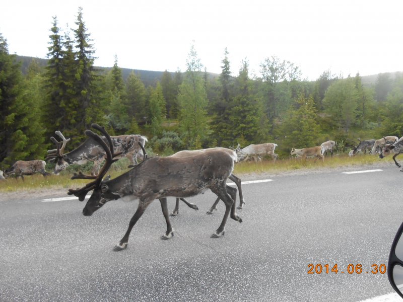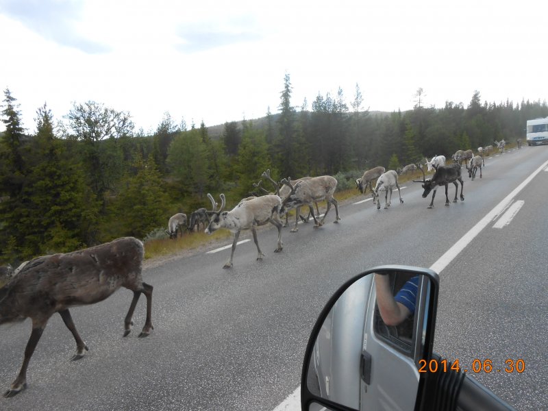 Idag börjar vår resa söderut nu ska vi åka E 45:an hela vägen till landet utom sträckan Wilhelmina, då vi tar vildmarksvägen istället. Åt lunch 2m söder om polcirkeln. Vid Fiskträsk träffade vi på vår första renhjord som kom emot oss på vägen ( ca: 150 till 200 st).